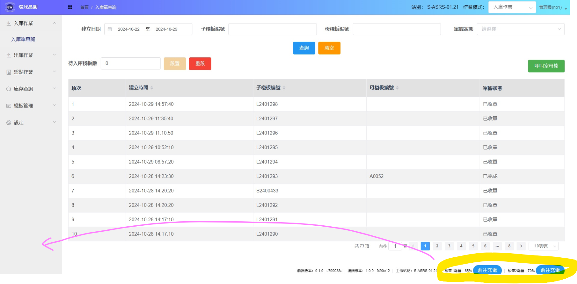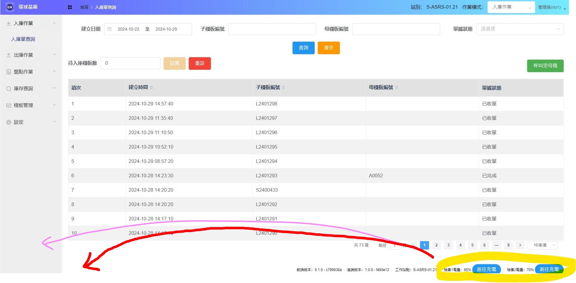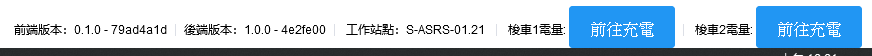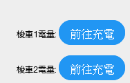 在任一頁面, 右下角 "梭車1電量: xx%" 和 "梭車2電量: xx%", 上方各增加1顆按鈕 "前往充電" (黃底示意處)